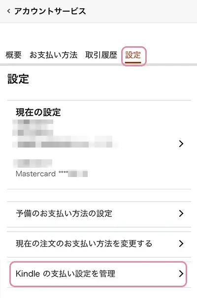 アカウントサービス→「設定」タブ→「Kindleの支払い設定を管理」からでも「コンテンツと端末の管理」は開けます。